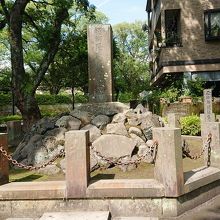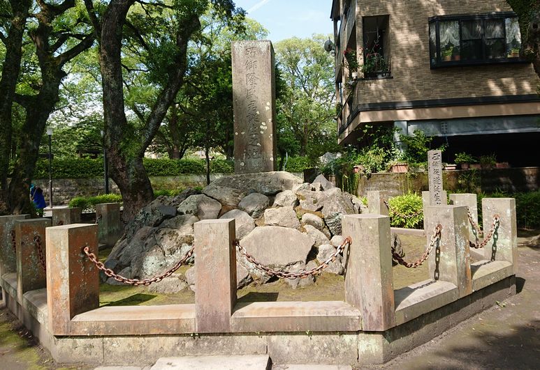 維新ふるさと館に行くために停めた駐車場、その近くの公園の一角に「西郷隆盛君誕生之地」と刻まれた石碑が立っていました。石を積み上げたその上に石碑があり、かなり立派なものでした。その横には弟「従道」の石碑、こちらはちょっと小さめでした。