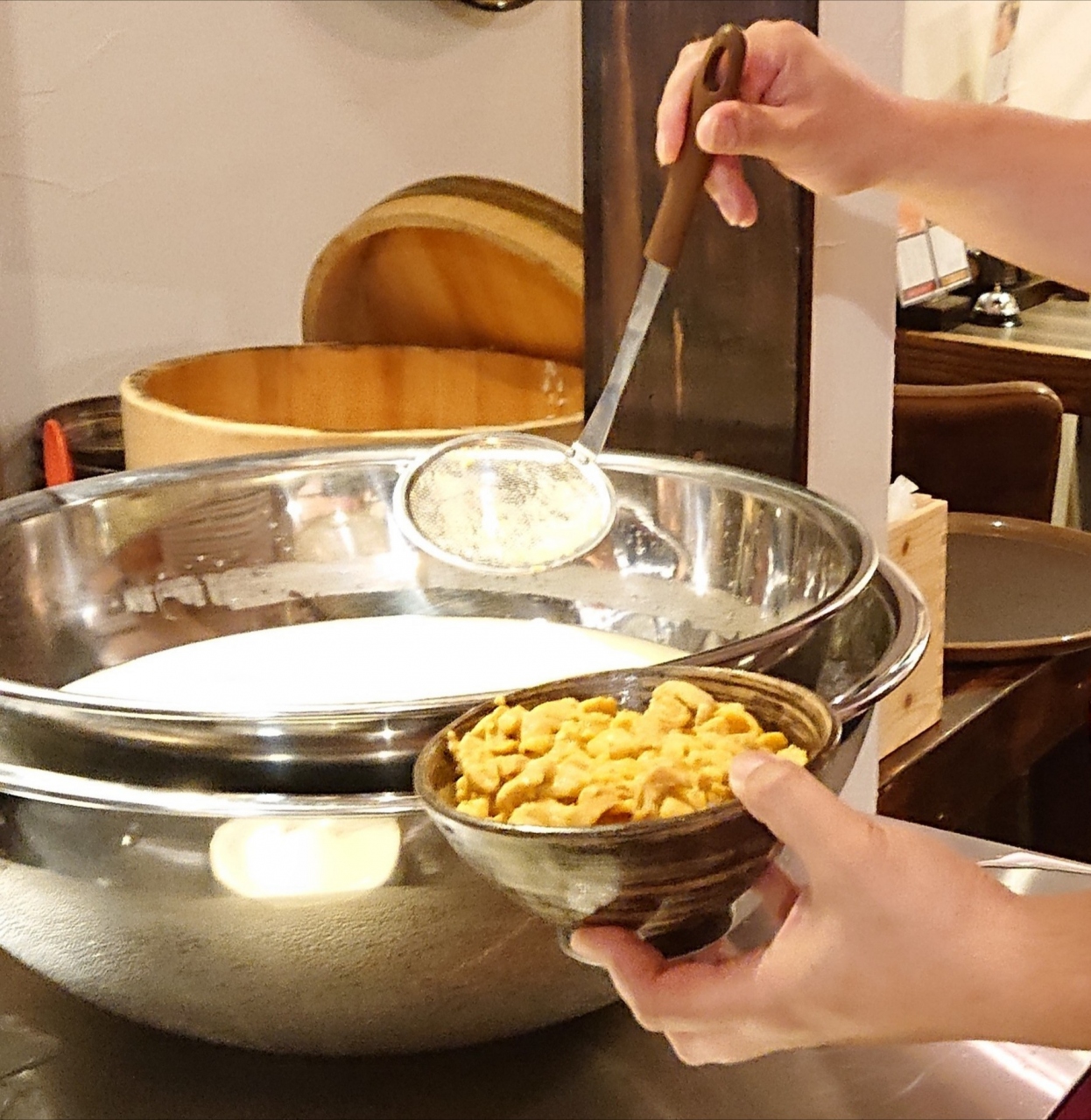 10:00オープンで順番が来て入店し席に案内され、朝うにぶっかけ丼を注文し、スタッフからの説明後、ボールにあるムラサキウニをすくいご飯の上にのせる。