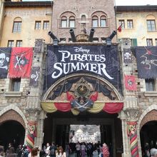 2019年7月の東京ディズニーシーへ行ってきましたが、前日からスタートした「パイレーツ・サマーバトル“ゲット・ウェット!」が開催されてディズニーシー・プラザからメディテレーニアンハーバーに向かうミラコスタ通りにはパイレーツのデコレーションが建物に掲げられておりました。