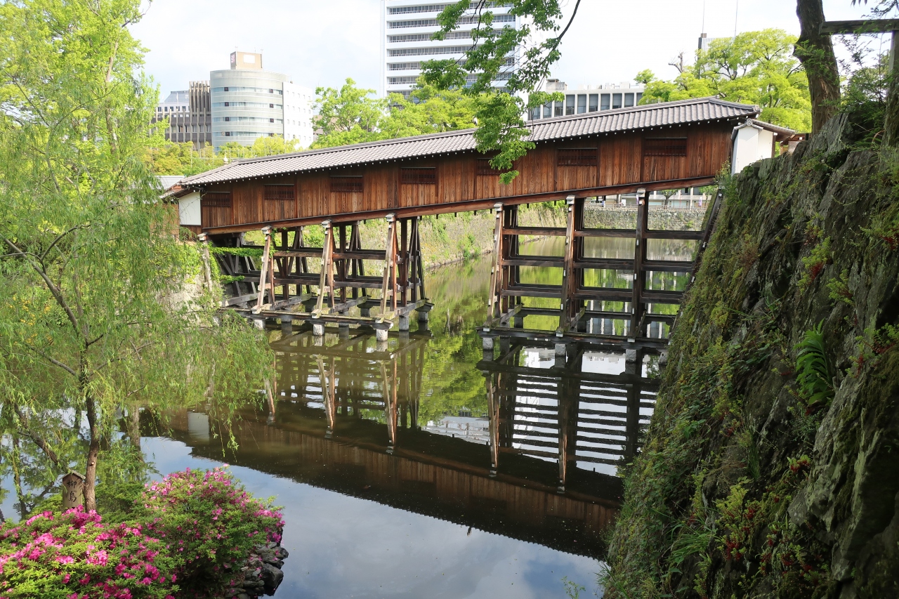 和歌山城天守閣の北側にある西の丸庭園が紅葉溪庭園です。徳川頼宣が作った庭園で、園内には名前通り紅葉の木が多くあり、GW時は青紅葉が楽しめます。また、園内には堀に浮かぶ鳶魚閣、藩主が渡った御橋廊下があり、日本庭園の美をつくづく実感させられる庭園です。行くなら朝の人が少なめの時間がお薦めです。