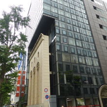 旧建築の外壁の一部をファサードとして残し、その背景に広がる近代的な壁面(ガラス面)と絶妙に調和している。