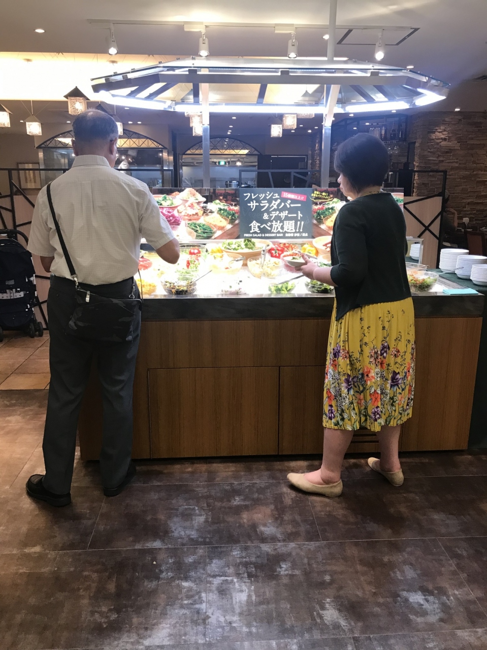 ハンバーグを注文!少し待つ間にサラダバーで野菜を取りに行きます。色とりどりの野菜が、冷やされていて美味しく食べれます。ハンバーグは鉄板に運ばれてくるので、ゆっくり食べてもなかなか冷めなくて美味しかった。ちなみにサラダバーにはちょっとしたデザートもあります。