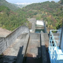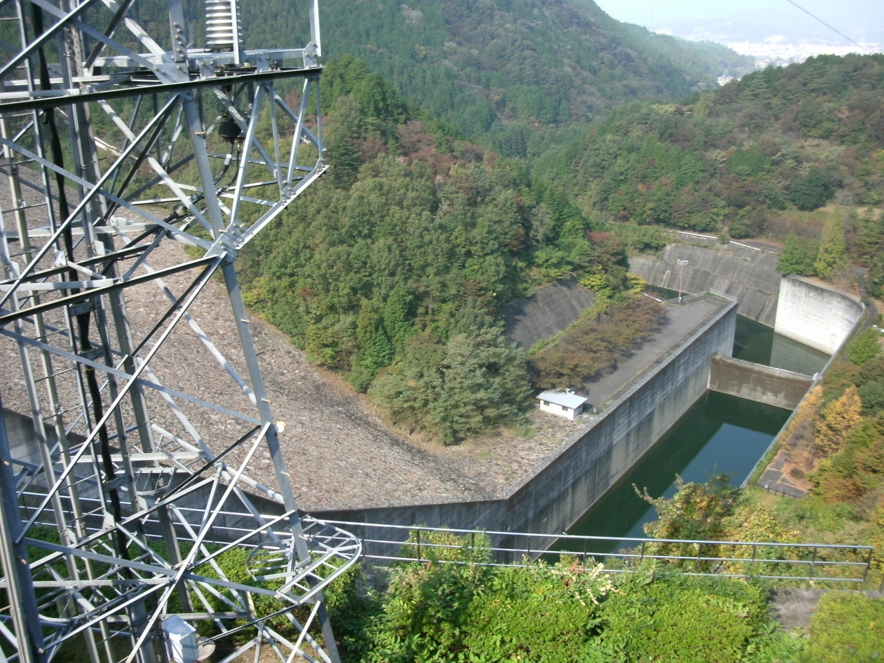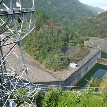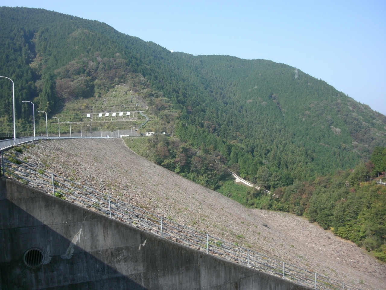 ダム軸が曲線を描くロックフィル式ダムで右岸に洪水吐があります。ロックフィル式ダムなので堤体がなだらかで下流側を観ても迫力はありませんが、石積みの堤体と紅葉し始めた山々と水辺の景色がとても良かった。堤の上は歩いて散策できるのでダムマニアでない人も自然を楽しむことができると思います。堤上からは遠く恵那市の町並み観ることができました。