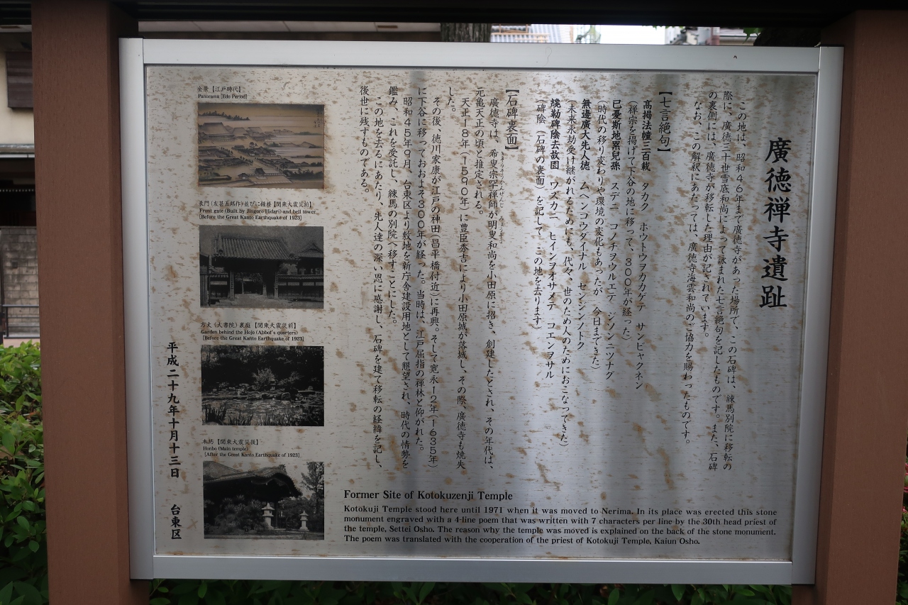 台東区役所の東側に隣接する広徳児童遊園の中に広徳禅寺遺跡の石碑が建てられています。台東区役所のある場所は昭和46年に練馬に移転するまで、広徳寺の境内があった場所で、江戸時代は「びっくり下谷の広徳寺」と詠まれる程の禅寺でした。区役所の敷地の大きさを考えると相当大きな禅寺だったことが伺えますが、現在は石碑だけがのこるだけで余り見応えはありません。