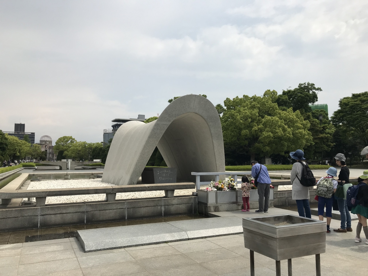よくテレビで見かける死没者慰霊碑ですが、実物を見たのは初めてです。GWだったので、沢山の方がお参りをしていて、沢山の花が手向けてありました。並んでお参りしましたが、慰霊碑の奥に原爆ドームが見えました。素晴らしい空間です。
