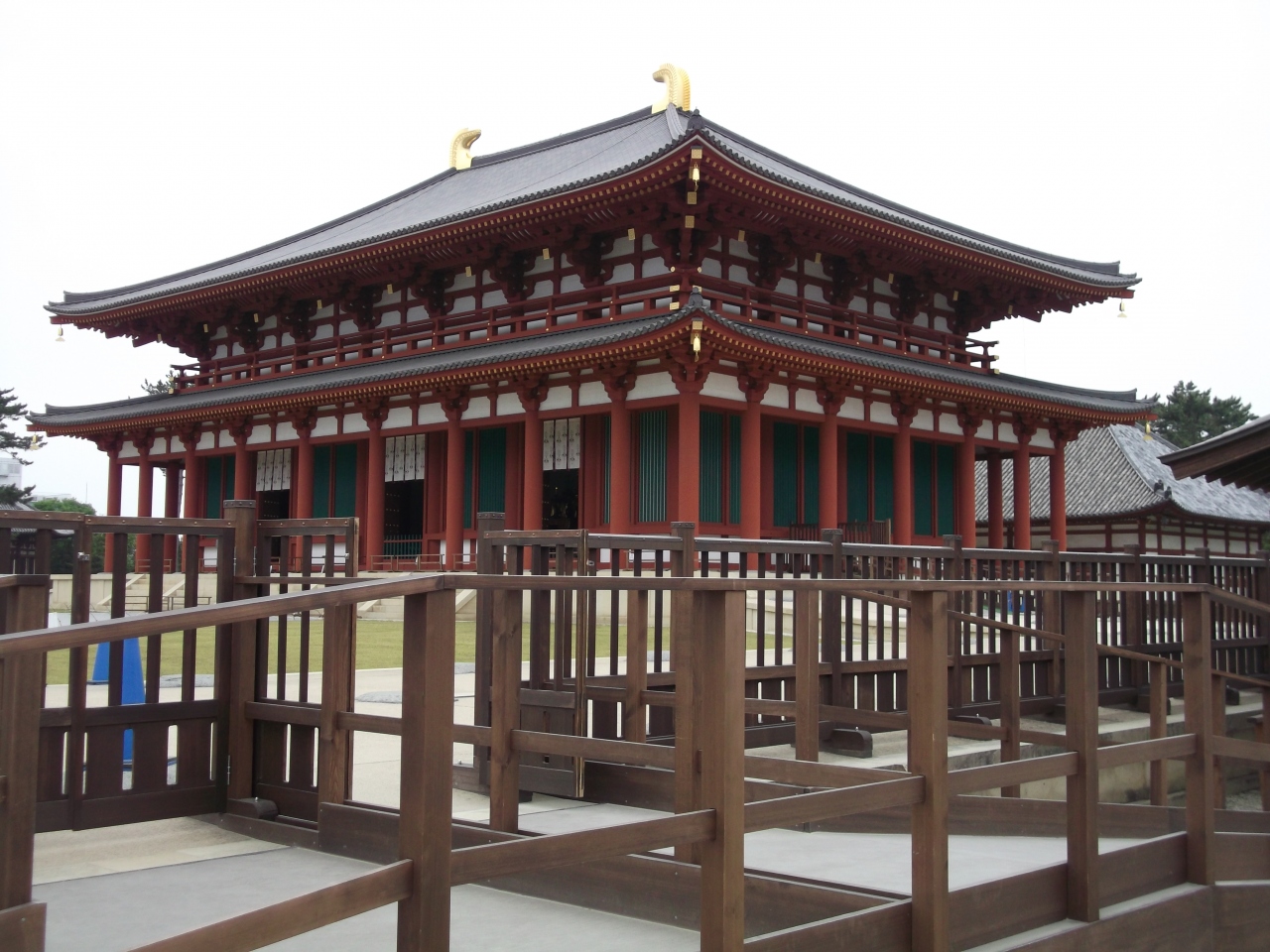 長い間再建工事がおこなわれていて何回も工事中の覆いを見るだけで帰っていましたが、ついに2018年秋に工事が終了しやっと中金堂にお目にかかることができました。最初に見た時は、あまりにも朱色の柱が色鮮やかで想像していたのとはずいぶん違い驚きましたが、新しい建物だからどうしてもそうなりますね。それでも重厚感のある外観は中金堂の名前にふさわしい力強さを感じました。