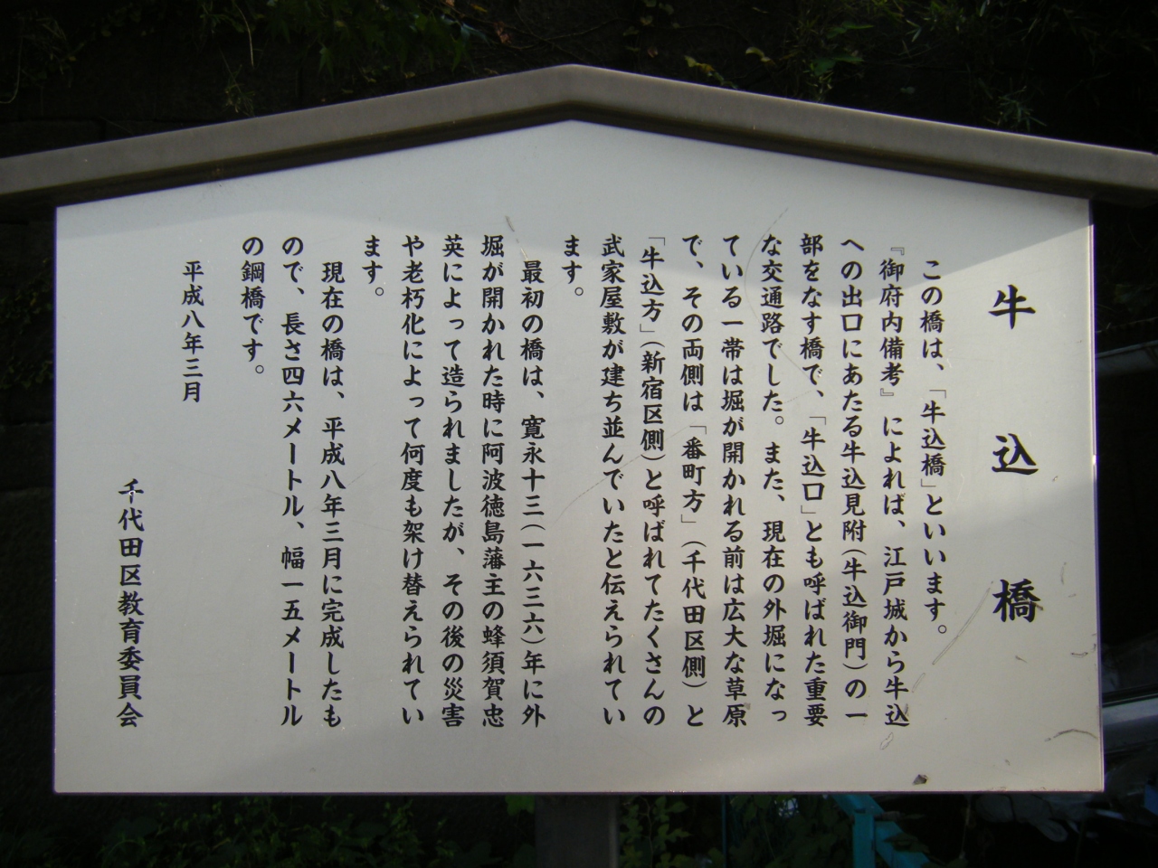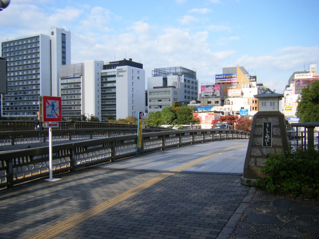 飯田橋駅の西口を出てすぐの場所、早稲田通りにある橋です。江戸城から牛込への出口にあたる要所の橋で、寛永13年(1636年)に最初の橋が架けられて以来、幾度も建て替えられてきたそうです。現在の橋は平成8年に建て替えられた比較的新しい橋です。欄干の端には楼閣のようなオブジェが乗っかっており、かわいらしい橋です。休日の早朝ということもあり、車通りも人通りも少なかったですね。