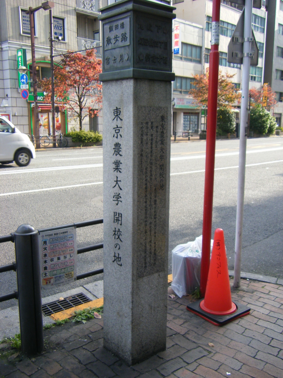 東京メトロ東西線の飯田橋駅A4番出口を出てすぐの目白通り沿いに東京農業大学開校の地の石碑が立っています。明治24年(1891年)に東京農業大学の前身である育英學農業科がこの地に出来たのが始まりだそうです。創設には榎本武揚らがかかわったと石碑に架かれており、海軍軍人の印象しかなかったため非常に驚きました。調べてみると榎本武揚は蝦夷地開拓を任されており、北海道の開拓に置いて農業の必要性を感じたことから農業大学の創設に携わったとの事で、一つの歴史から多くの面白いつながりを知ることが出来て良かったです。