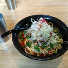 つけ麺、混ぜそばの流行りにやっと慣れて来ました。ピリ辛を期待して坦々混ぜそばを食べてみました。麺の大盛りや最後の追い飯は無料とのことでしたが、普通でも食べごたえ十分ありました。最後に坦々の汁が残り、お湯を入れてスープにしてみましたが追い飯はこの時なのですね。トッピングはじめメニュー色々は券売機で確認、お洒落な雰囲気の綺麗なお店でした。