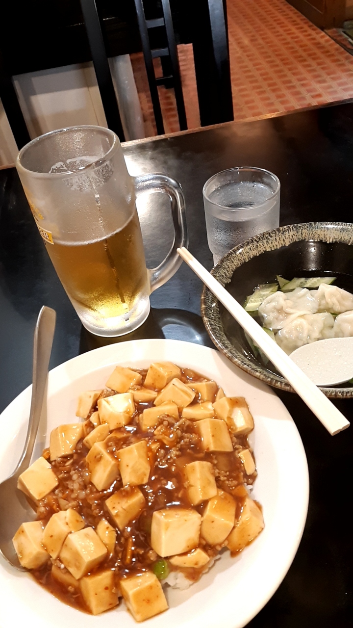 水餃子スープはあっさりとしておいしい。マーボーどんぶりは普通。