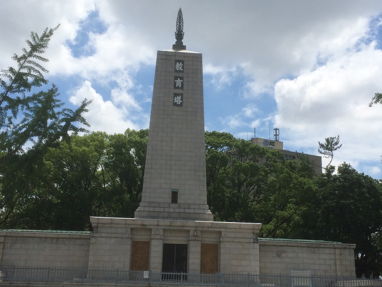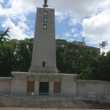 大阪城公園内の外堀の道沿いの外側にはあるので、高く目立つ塔でしたが人もいなかったです。砂利道の後方に階段があり中央は扉、左右は彫刻のような人の絵が彫られているような感じでかなり頑丈そうな高い塔で遠くから見ると煙突のようにも見えました。