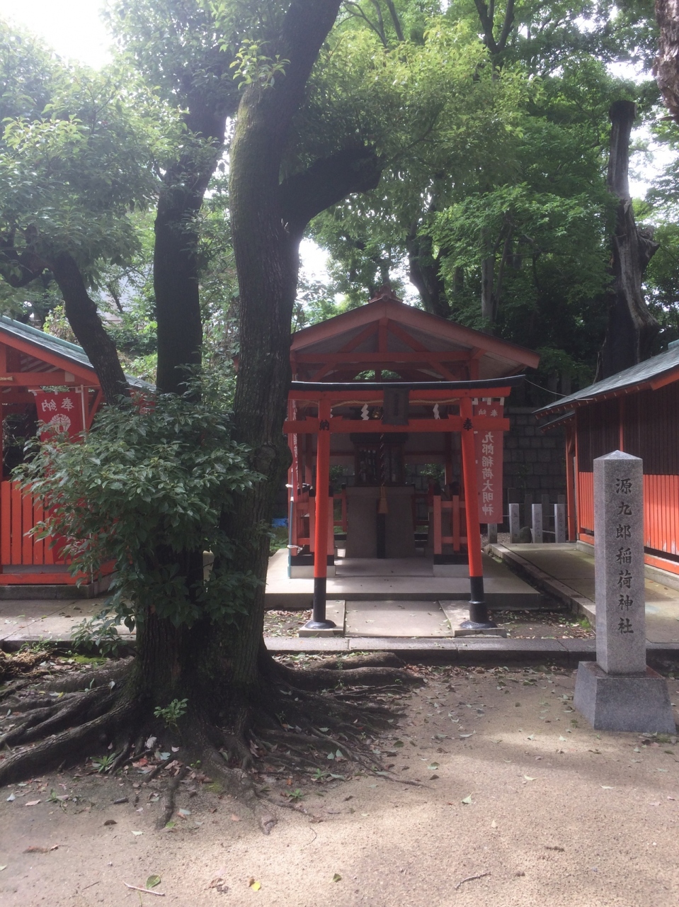 同じような建物の神社が3つ並んだ真ん中にある神社です。建物の前には赤い鳥居があり建物の社も赤で、幟も赤色でした。後方は高い木が数本立っていて、前方にも高い木があります。生国魂神社境内にあり、静かな場所にあります。