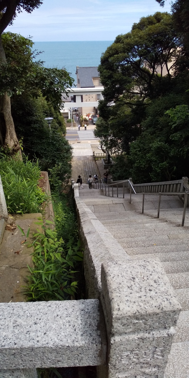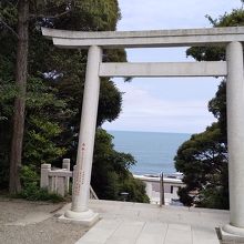 神社は高台にあります。海からは、急な階段またはスロープで上ります。