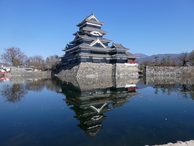 国宝松本城。内堀に囲まれた天守閣一帯は有料となっていますが、その外側は無料の公園でした。お堀沿いに多くの観光客がそぞろ歩き。天守閣をバックに写真を撮る人の姿が目立ちます。ウエディングドレスの花嫁さんを中心に結婚式の先取り写真を撮るグループもいました。全国で12しかない江戸時代の天守が見ることはとても面白い。でも、記念撮影の写真を撮るには内堀の外側のほうが楽しいです。堀に映る逆さ天守閣のほか、朱塗りの埋の橋と天守のコラボが撮影できるなど、さまざまな工夫ができます。政治の中心だった二の丸御殿もなぜか堀の外側にありました。