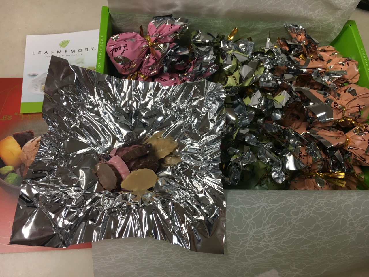 抹茶やストロベリー、コーヒーなど3~4種類の小さくて可愛いこの葉のチョコが6~7個づつ巾着のように包まれています。その可愛らしさに子供も大喜びでした。ひとつづつ味わって食べる、上品なチョコレートで、とても美味しかったです。