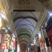 アーケード式の商店街で、お店がずらりと並んでいます。