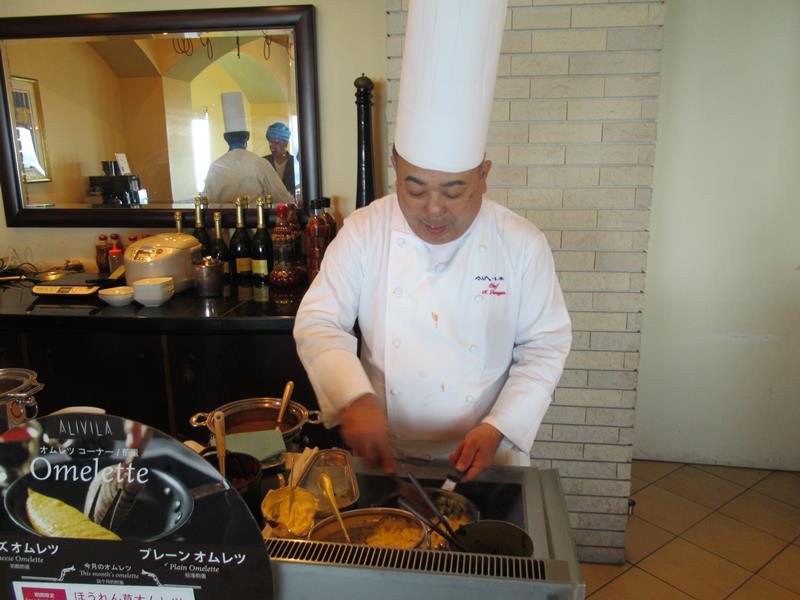 シェフが目の前で焼いてくれるオムレツ。定番オムレツの他に月替わりオムレツもあります。