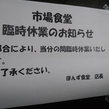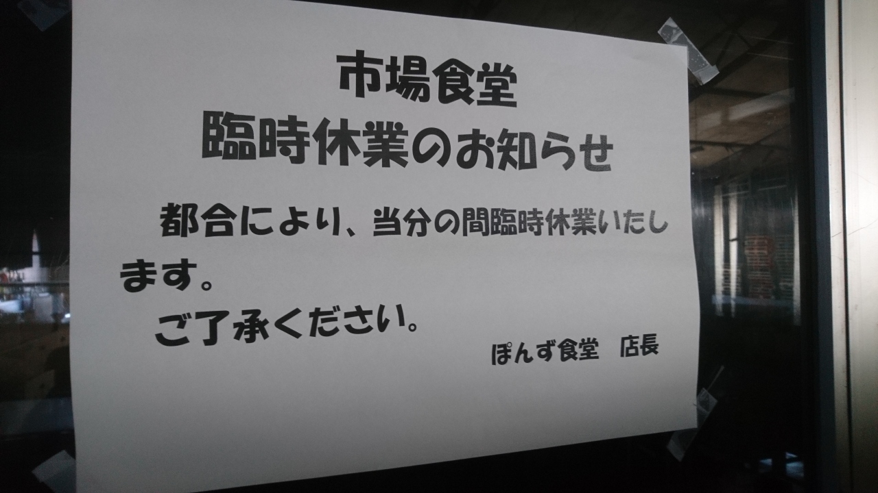 千歳の卸売市場の中にある食堂です。市場の中の食堂を見ると、そこの街の特産品や繁栄ぶりがわかります。そこで千歳の卸売市場に行ってみると、薄暗いところに、ここの食堂がありました。どうやら店は閉まっているようです。それも、いつ再開するかわからない雰囲気でした。残念です。再開したら伺いたいです。