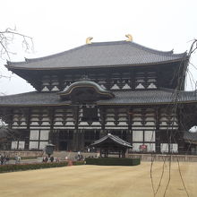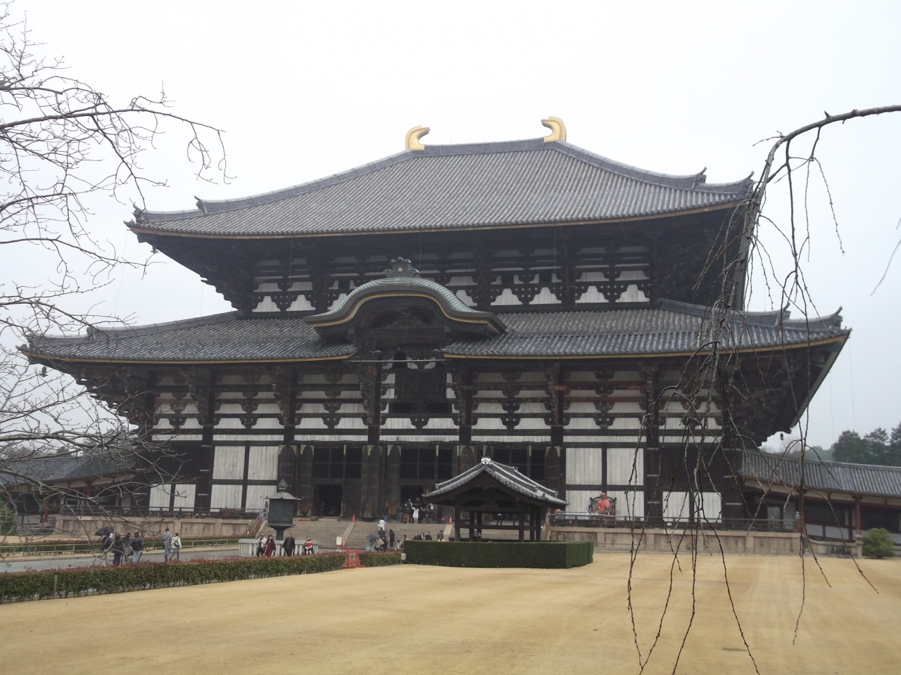盧舎那仏像が鎮座する木造の巨大な建物、大仏殿です。現在の金堂でも建ってから300年以上経っているだけに、木の傷みなどが目立ち長い歴史の流れを感じさせます。均整のとれた大きくて美しい外観なので、少し離れた位置から見るととても絵になって見えます。