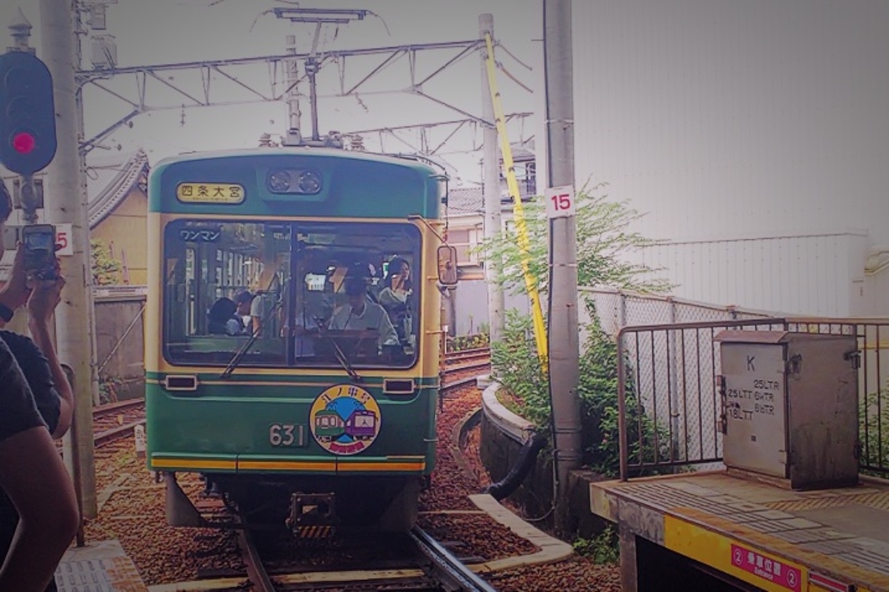 休日の朝に始発駅の四条大宮から嵐山行きに乗りました。駅舎がレトロな路面電車ですが、ICカードも使えます。しかも均一運賃なので、降りるときに一度ピピっとかざせば大丈夫です。四条大宮からの乗客はだいたい座れましたが、その後の西院駅からは満員電車となりました。小さなお子さん連れだと四条大宮から乗車したほうがよいかもしれません。