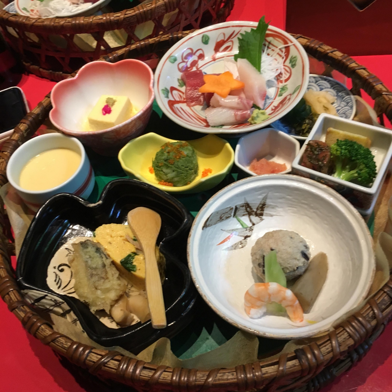今回はかご盛り膳をチョイス。かご一杯にお造りや茶わん蒸しなどのおかずの皿がぎっしり。味も薄味に仕上げてあり美味しかったです。