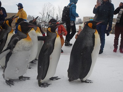 雪が積もっていないと実施されないそうで、しかも3月は午前の1回だけと聞いていたのですが、この日は2時30分にも行われ、ペンギンたちの愛らしい姿が見ることができました。