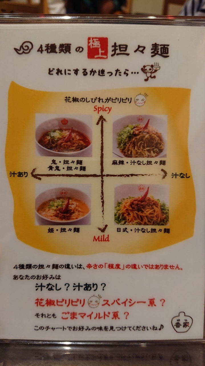 担々麺は汁有り・なし、辛口・甘口の度合いを、つまり4種類から注文できます。