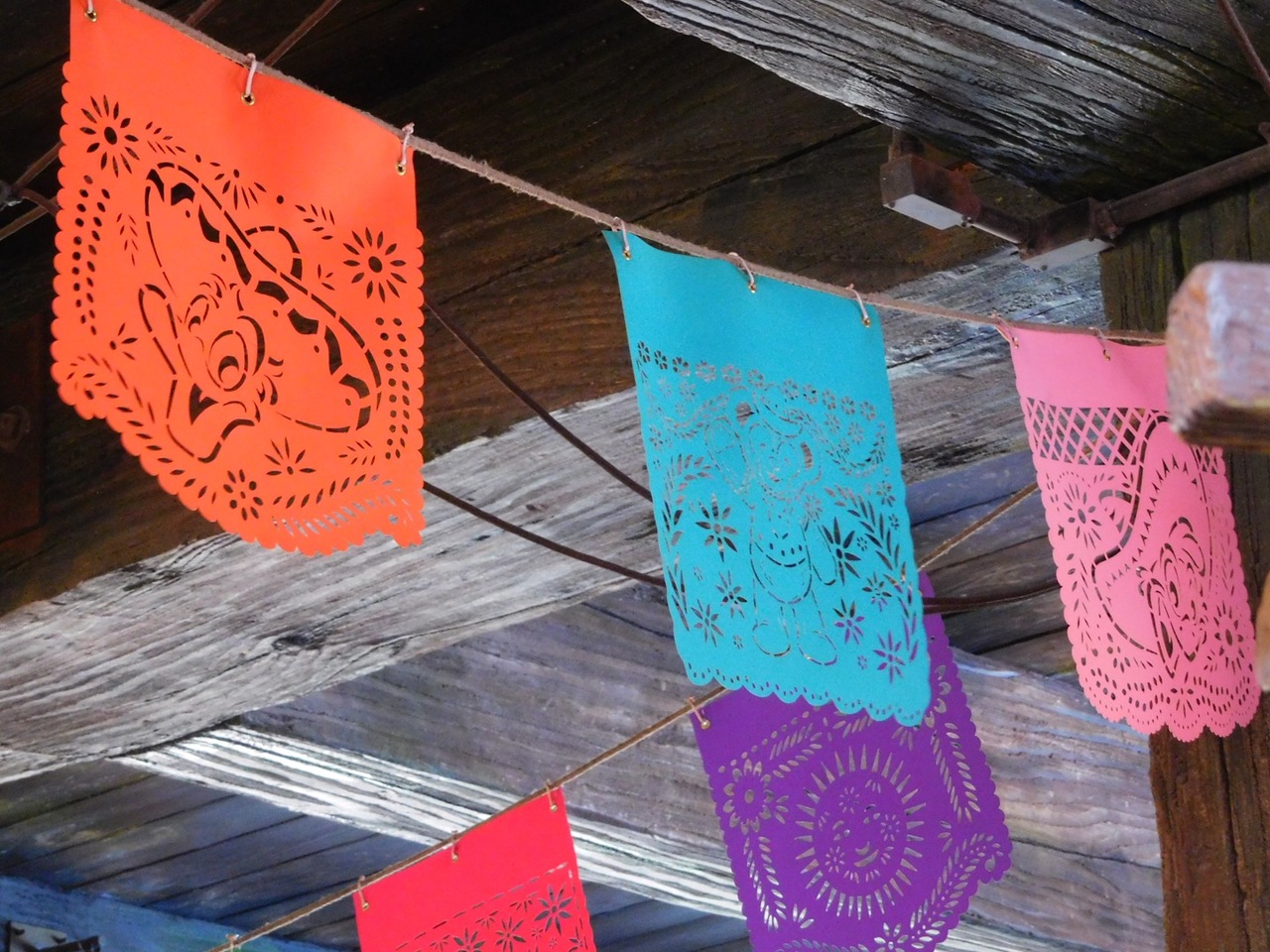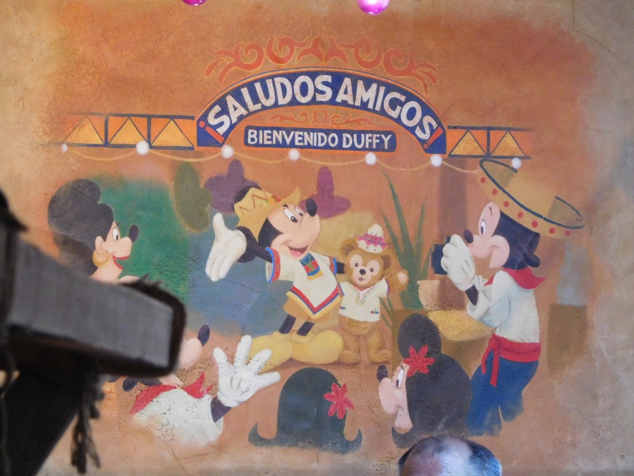 天井には3騎士(ドナルド、ホセ・キャリオカ、パンチート)のフラッグはまだあるものの、ダッフィーのフラッグも加わって、壁の絵もダッフィー仕様に描きかえられていました。