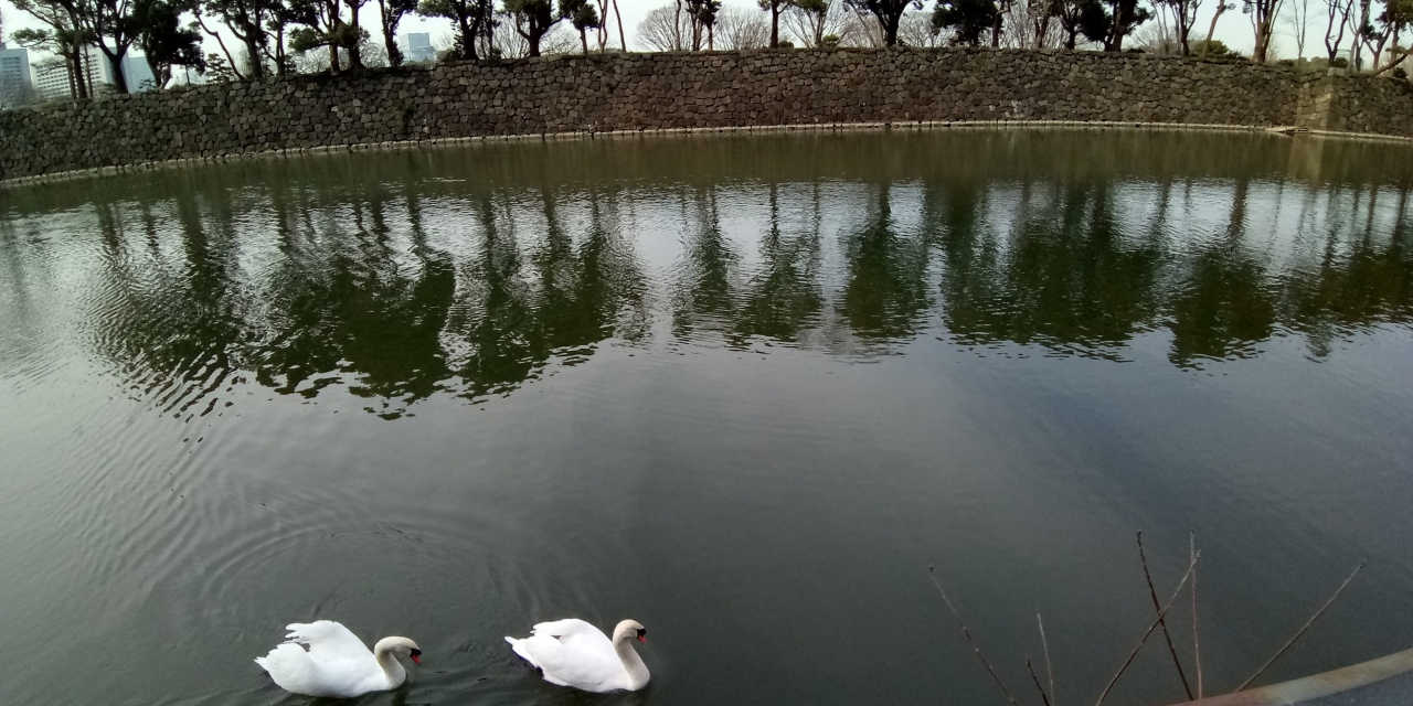 皇居外苑というと、完璧というほど維持管理された松の木々・芝生などを思い浮かべますが、皇居外苑を囲む濠もたいへんきれいで見逃せない観光アトラクションだと思います。特に寒い冬の時期には、きれいな白鳥が泳いでいるのを見られます。
