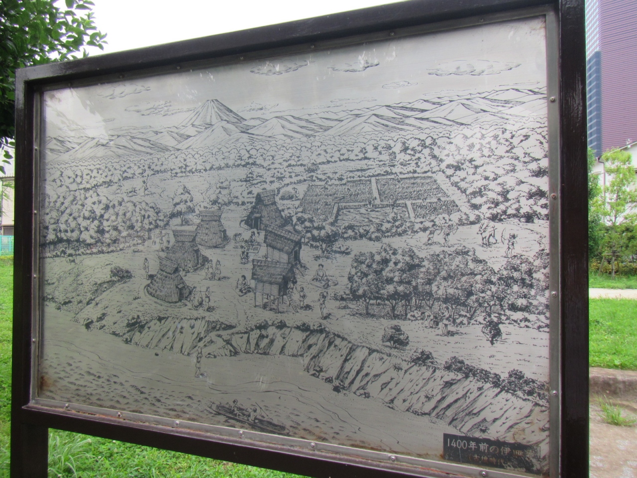 当時の集落の様子を描いた看板が立っていますが、絵にあるような富士山も丘の下の海も、現在の場所からは見ることができません。