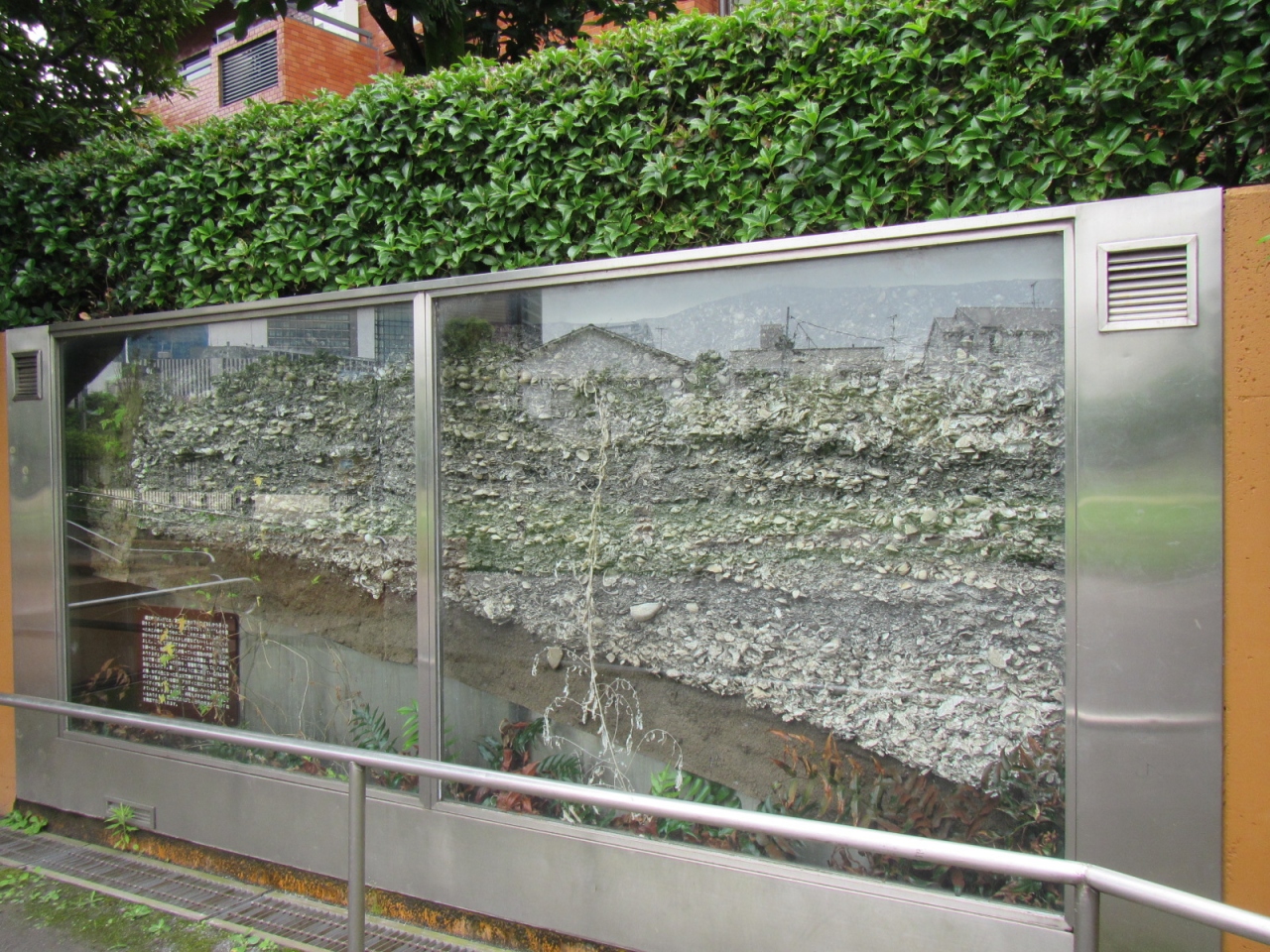 貝塚の地層の薄層断面の屋外展示