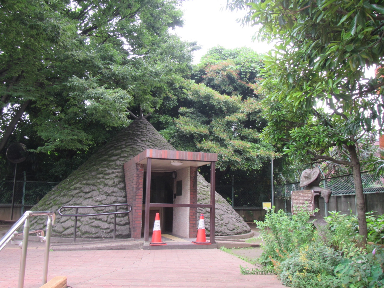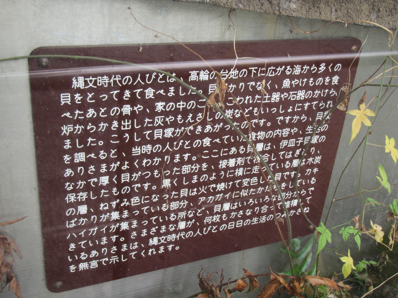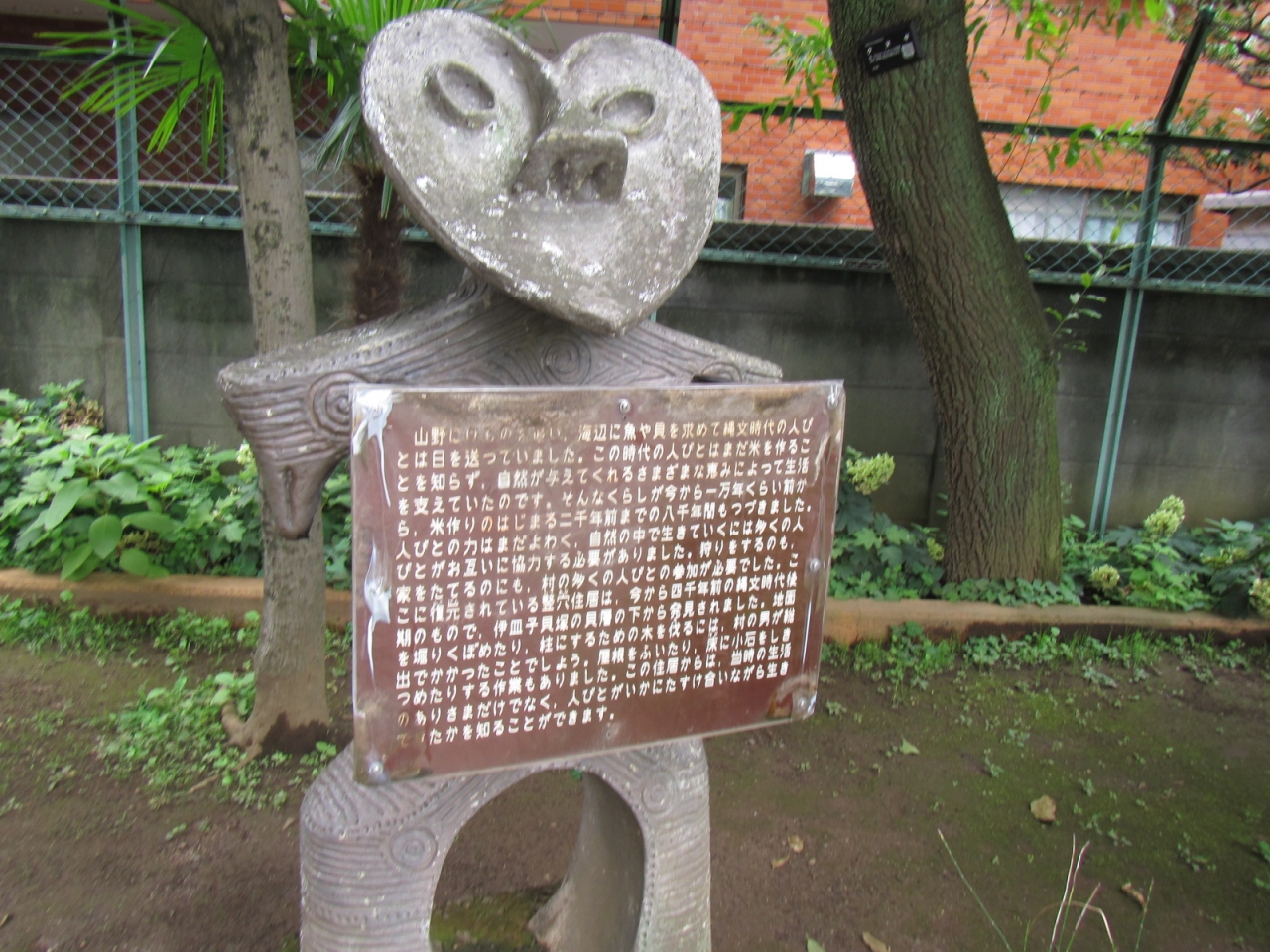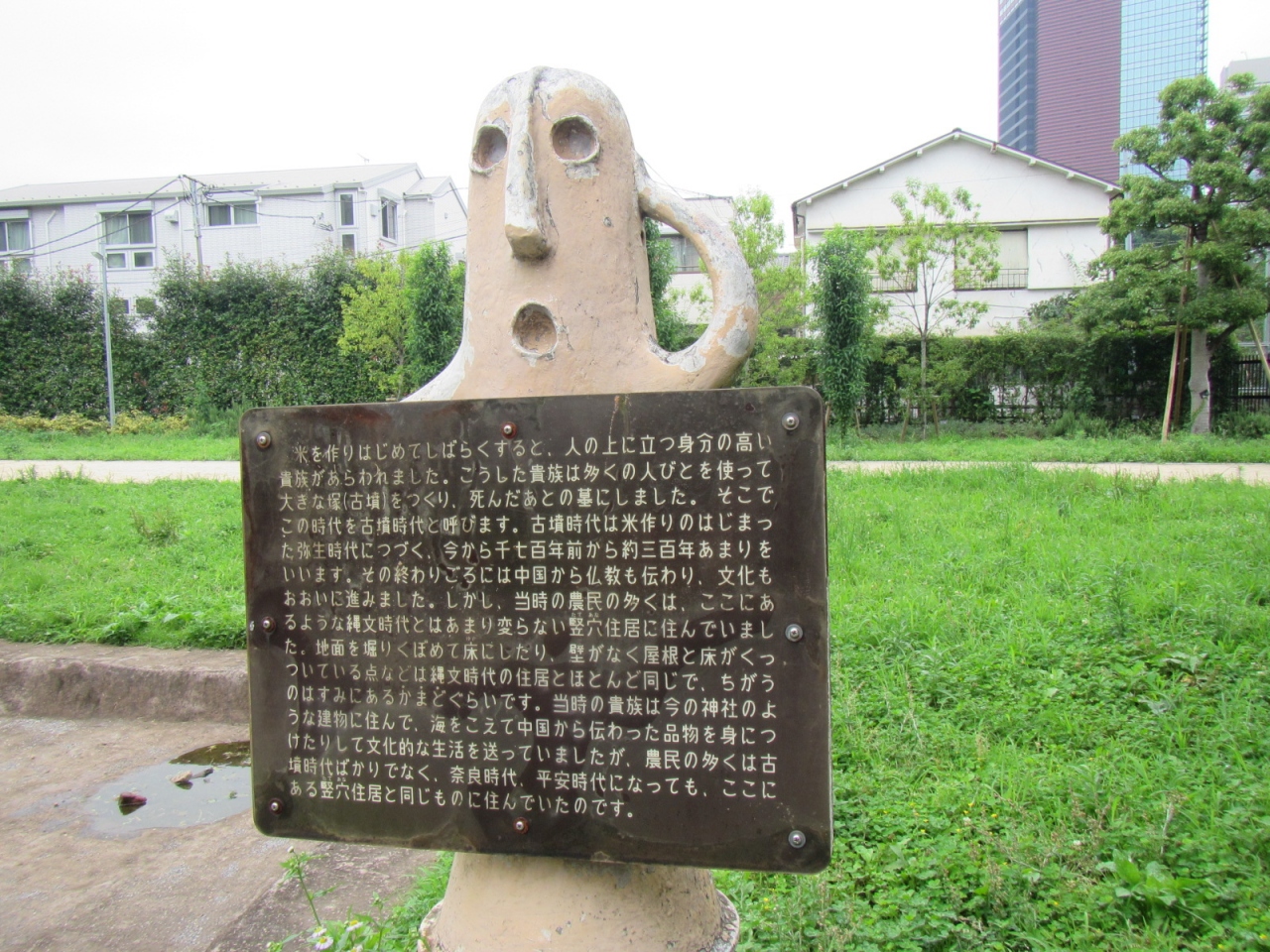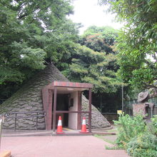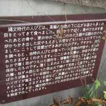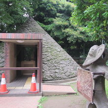 公園に貝塚の地層の薄層断面の屋外展示があって、その横に昔の竪穴式住居を再現した展示もありますが、いずれも公共のモニュメントのように公園内に佇んでいて、見学無料です。