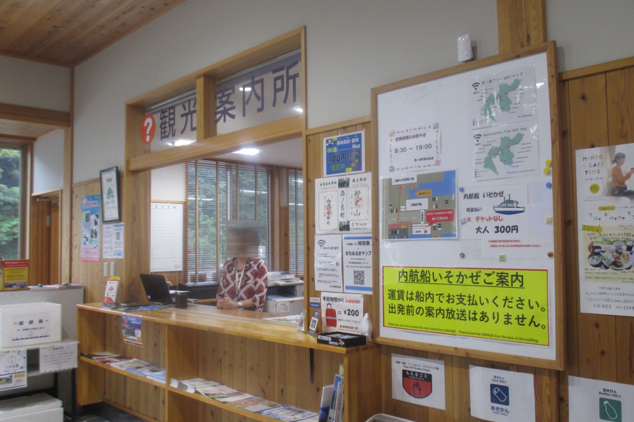 境港からの隠岐汽船のフェリーが着いた別府港ターミナルの1階にありました。フェリーの乗船客の中では個人の観光客が少なかったのか、窓口を利用しようとする人がいなく、係の人も手持ち無沙汰風でした。最近はネットでほとんどの予約や情報が得られるので、利用の度合いが減っているのでしょう。