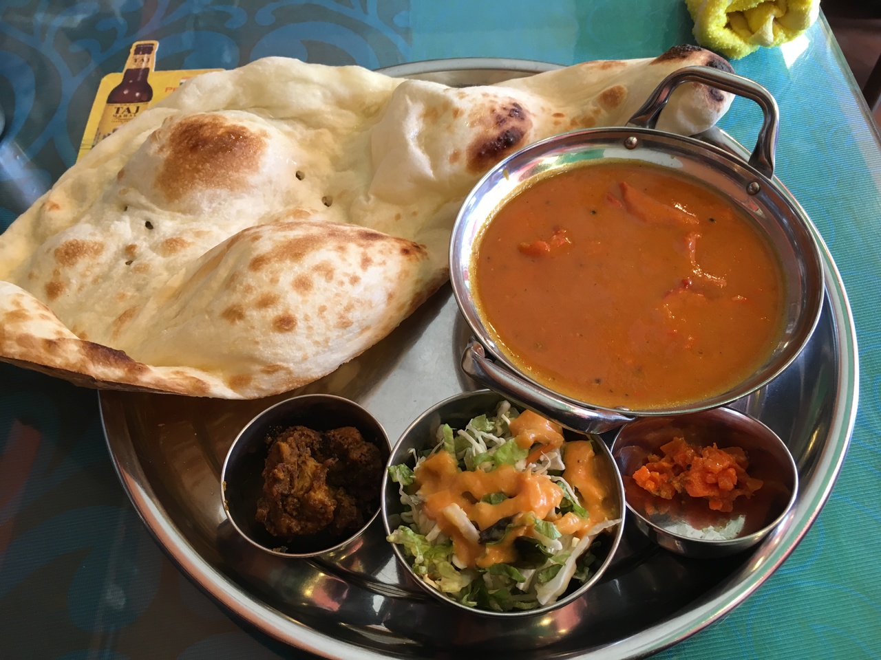日替わりランチカレーもあります。ミニサラダ、ナン、付け合わせ➕食後の飲み物がセットなのが、嬉しいですね。ナンのおかわりも自由です。おかわりサイズも選べて、2/3 とか ちょっと小さい、半分など。 私のお気に入りカレーは、バターチキンカレーを辛めにしたもの。また、ほうれん草チーズもガーリックが効いて美味しいです。食後のチャイもアツアツです。