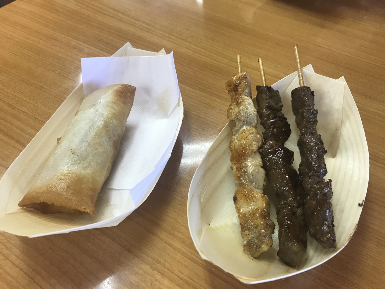 串焼き3本セットとガーナ春巻きを食べました。串焼きは、ワニ、ラクダ、ダチョウの3本セットで1000円とかなり割高です。ワニが一番おいしいです。