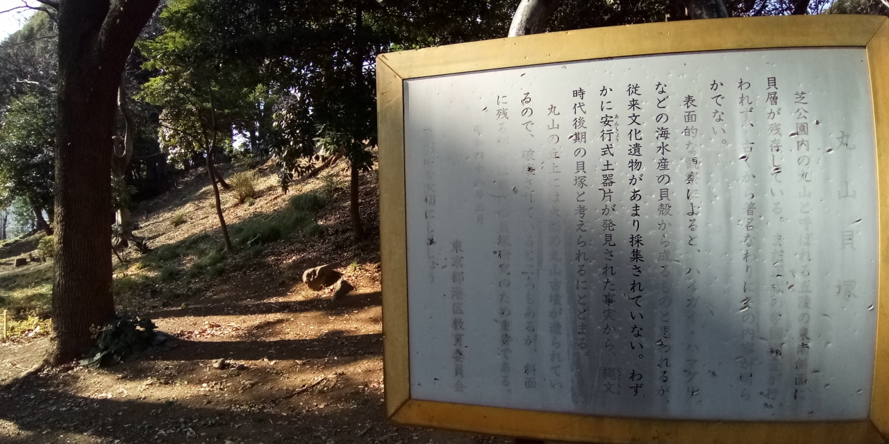 丸山貝塚は、東京の都心部にある芝公園内の中にある丸山古墳の斜面にあります。かなり平らな芝公園に、きゅうにこんもりと結構高い丘陵地の丸山貝塚があり、驚きです。説明板は結構傷んでいて読みにくいですが、文化遺物はあまり発見されなかったみたいです。