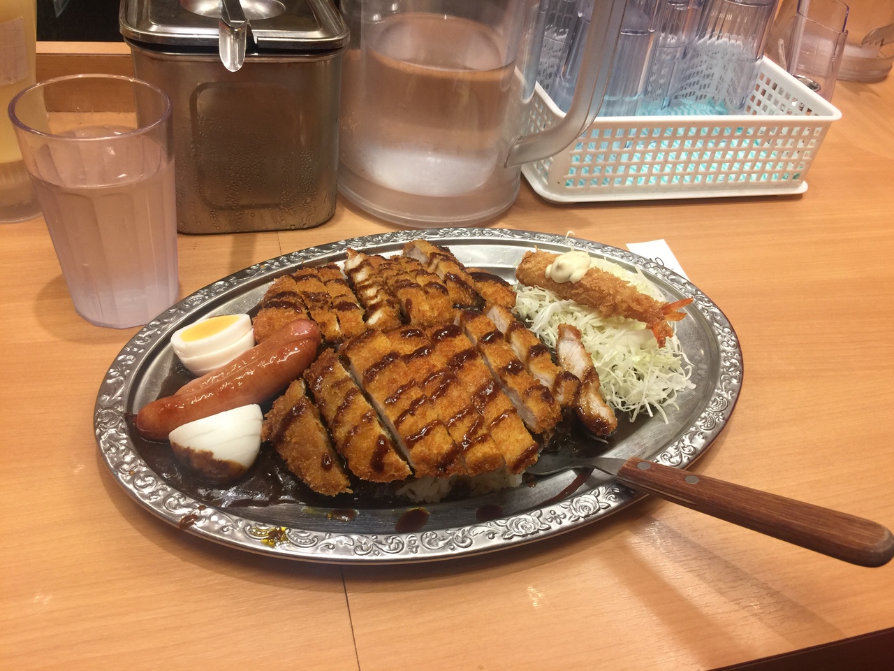 食べたのはメジャーカレー中盛1,100円!ロースカツ、チキンカツ、エビフライ、ソーセージ2本、ゆで卵がのっています。