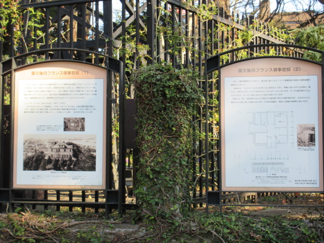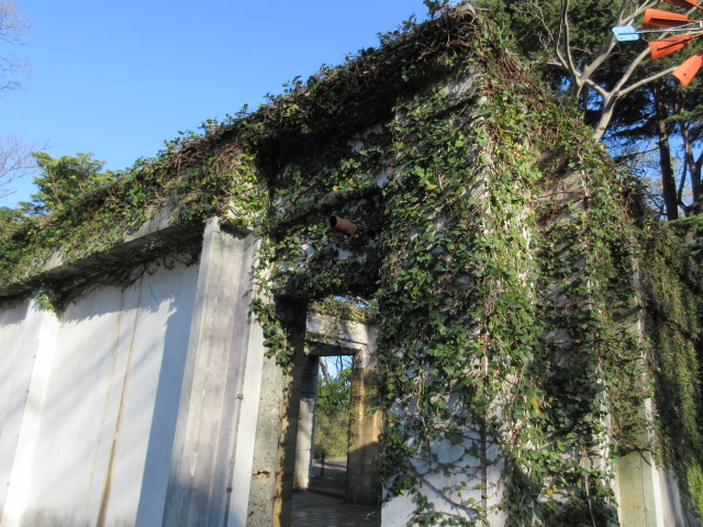 横浜の港の見える丘公園のフランス山の地区にある遺構です。公園の丘から少し下がったあたりにあって、柱や館の跡が残っています。説明板もあってわかりやすいです。風車もたっていますので目立ちます。昔はフランス領事館がここにあったとのこと。関東大震災で壊れてしまったそうです。現在はツタなども絡んでいて、ちょっとした遺構っぽさを出しています。