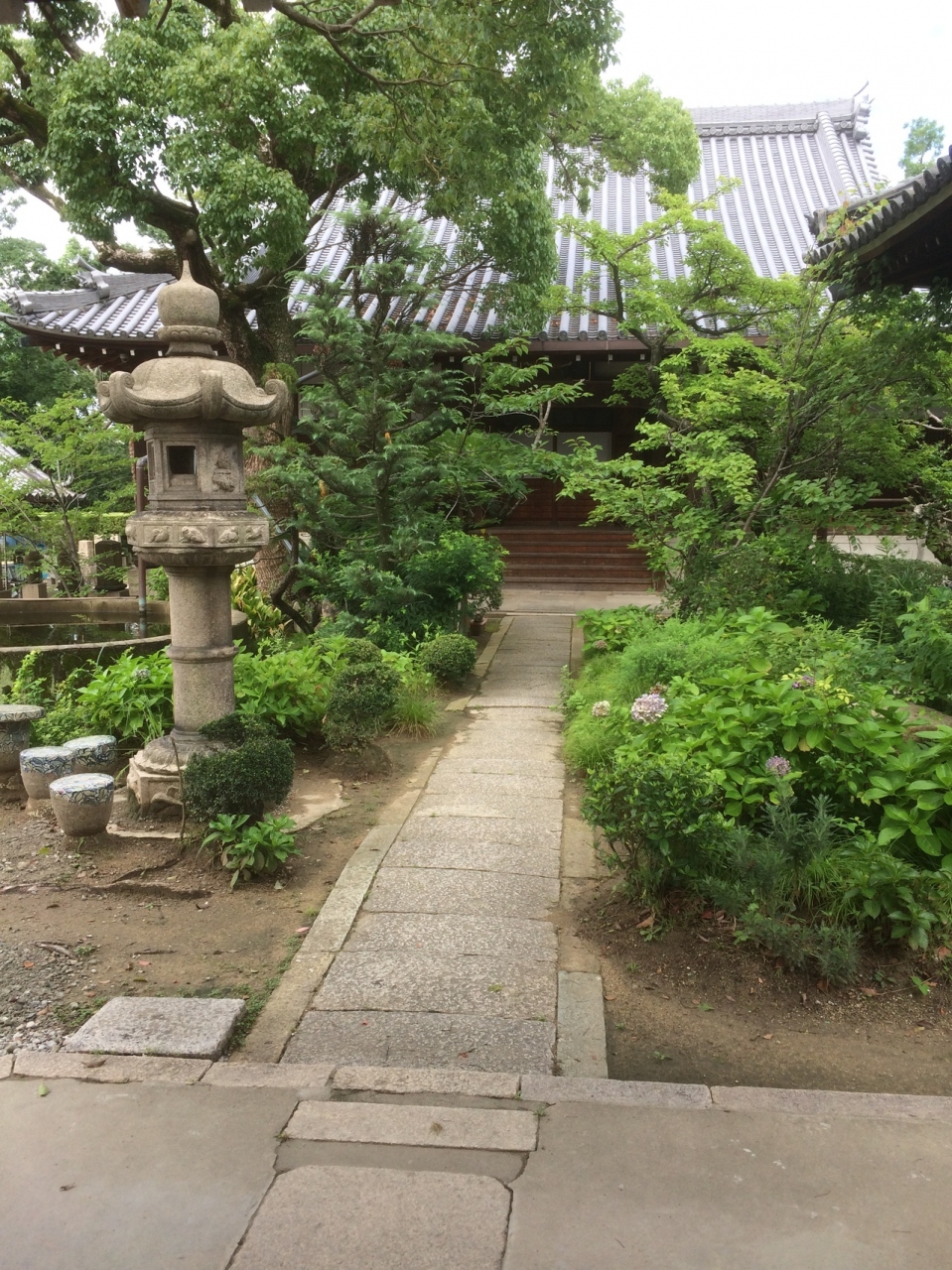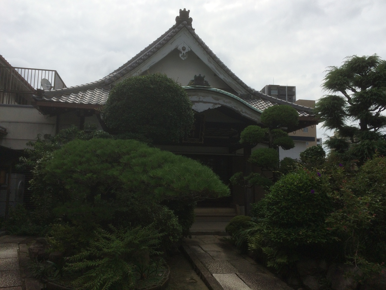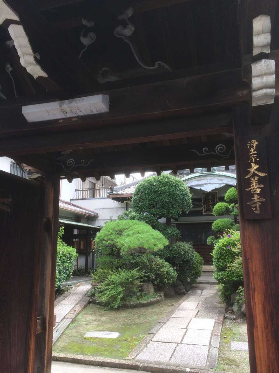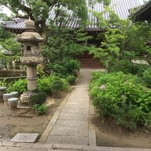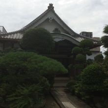 塀が長く白色で上の部分は赤ぽい色の線が入っていて斬新に見えました。門は古く木に年季が入っていました。境内を覗くと松が多く、松のほかの木も丸みを帯びて綺麗に整備されていました。門の瓦屋根が急な屋根でした。