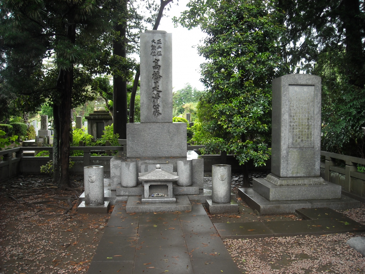 元首相・226事件で死亡。軍備縮小に問題があったようです。大臣から見て若手将校の行動など映画ドラマにおいて任侠映画の端役で充分だったでしょう? 戦時国債・裏白紙幣。等々の功績がありますが、ある種裏方の実力者・・・目立ちません。雨の中ひっそりとたつ墓石に歴史の重みを知りました。