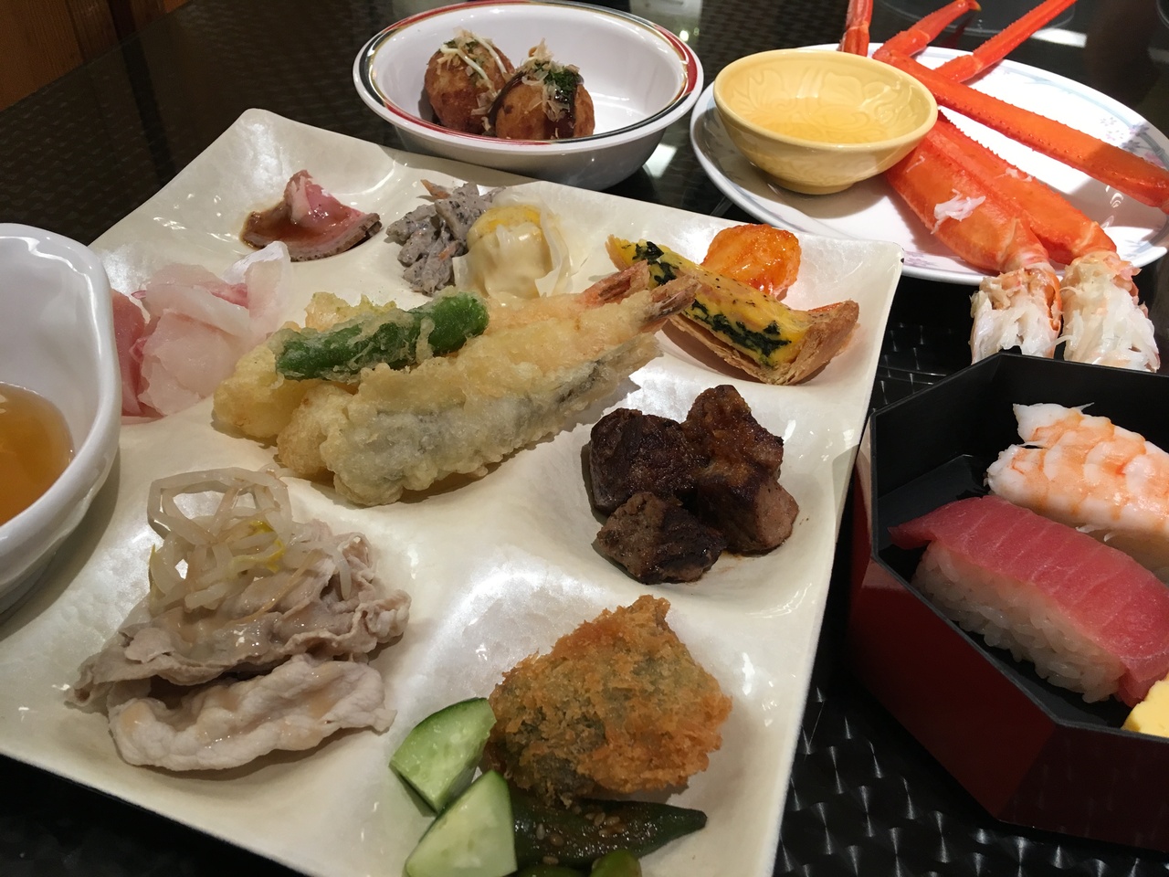 料理は、刺身や茹でカニ、揚げたての天ぷらやステーキなど色々ありました。