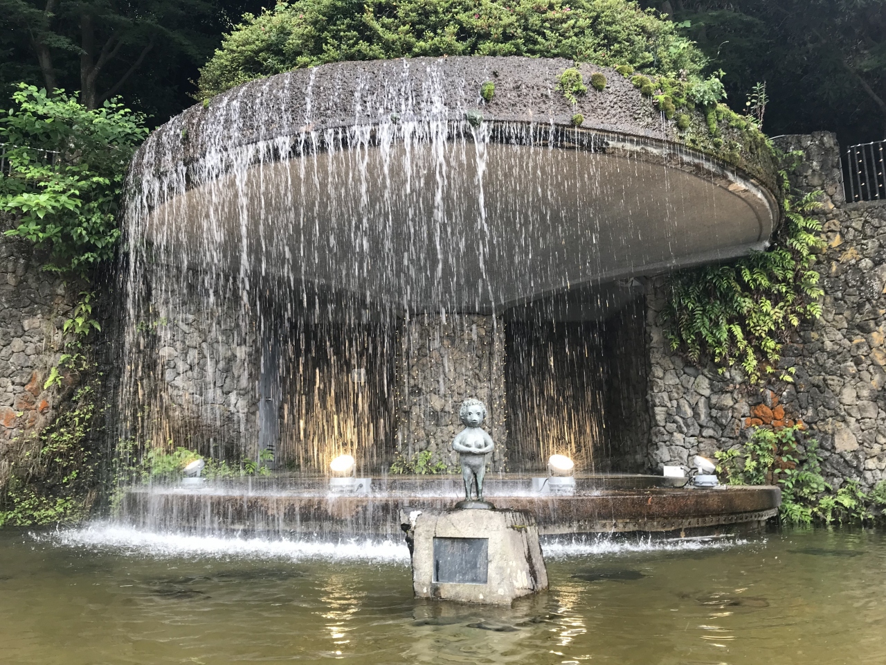 太閤橋を渡ってすぐ目の前にゆけむり広場があります。大き目の池の真ん中に河童の女の子の銅像があってなかなか可愛いです。敷地内には秀吉の座像があります。細かい皺が沢山彫られていて、こだわりが感じられます。特に服の部分が無地ではなく模様が彫られているのが珍しいと思います。