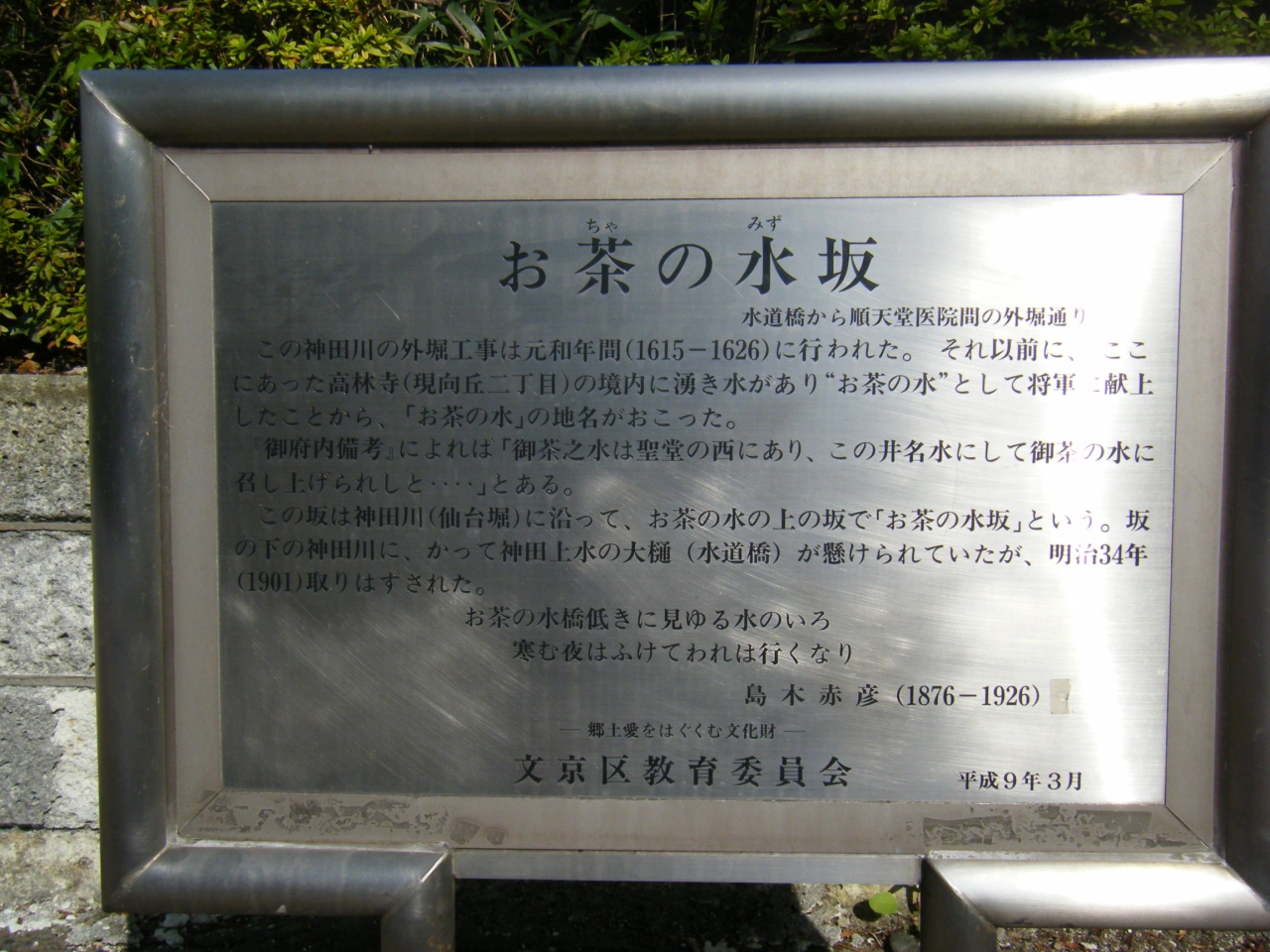 水道橋駅東口を降りて神田川の北側の外堀通りと呼ばれる通りを御茶ノ水方面に進むとすぐに坂道になりますが、この坂道がお茶の水坂と呼ばれています。お茶の水という名前の由来も説明板に書かれており、神田川の外堀工事よりも前にこの地にあった高林寺というお寺の境内の湧水を将軍家にお茶用の水とし献上したから名付けられた地名だそうです。坂道自体は普通の坂道ですが、地名の由来を知ることができて良かったです。