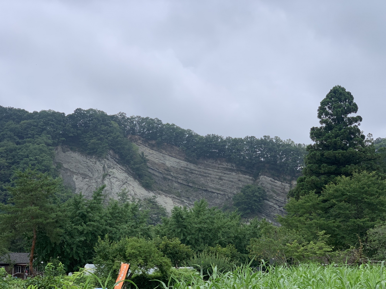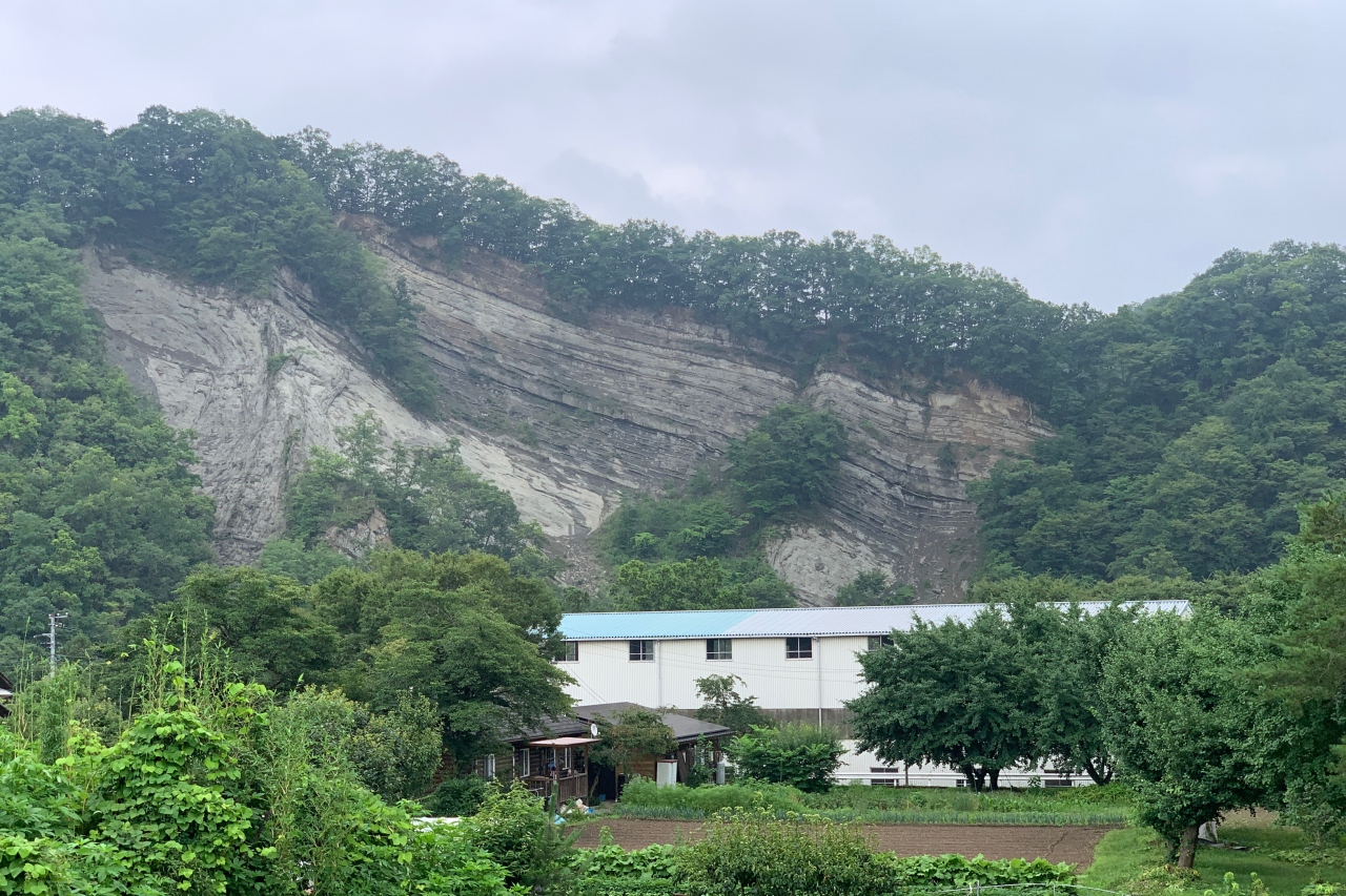 おがの化石館の近くにある白い岩肌の崖です。地層学的に重要な場所です。