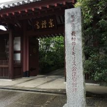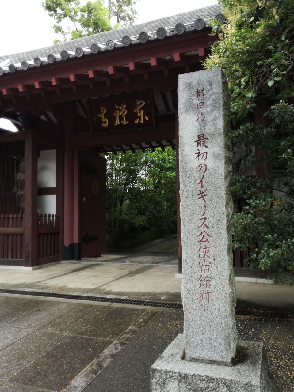 品川駅(高輪口)から歩いて5~6分程、第一京浜から少し入った閑静な場所にありました。このお寺は、1859年(安政6年)に日本初のイギリス公使館が置かれた場所ですが、山門横に「最初のイギリス公使宿館跡」と刻まれた石碑が建っているのみで、この石碑以外には当時をうかがえるものはなかったですが、歴史探検に興味がある人にはお勧めのスポットです。