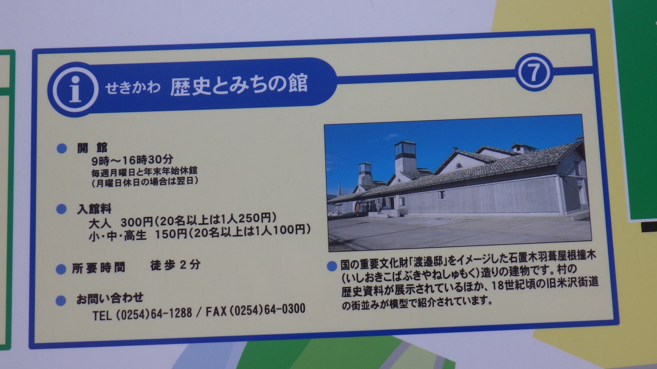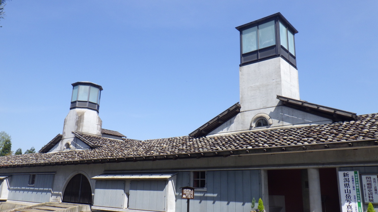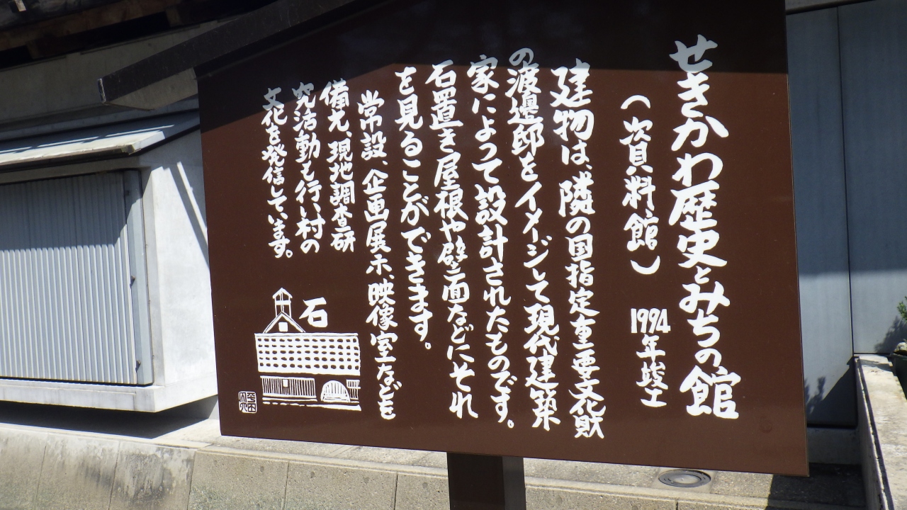 山形県南陽市から日本海側に向かって国道113号線沿い新潟県関川の道の駅関川敷地内中央の外見がとても印象的で駐車場から目立ち、芝生の散策路を少し上るとあります。関川村の歴史資料が展示されている施設で、国の重要文化財に指定されている渡辺邸をイメージして建てられた石置木羽葺屋根撞木造りの建造物です。