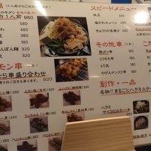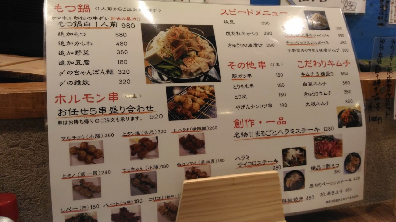 入口に30分飲み放題600円、ホルモン串は一本180円からということで、これはちょい飲みにはいいかと思い、よく見ると月曜から木曜の19時まででカウンター席限定で30分飲み放題に串2本と一品ついて1000円セットがある。これは面白そう、さっそく入店。