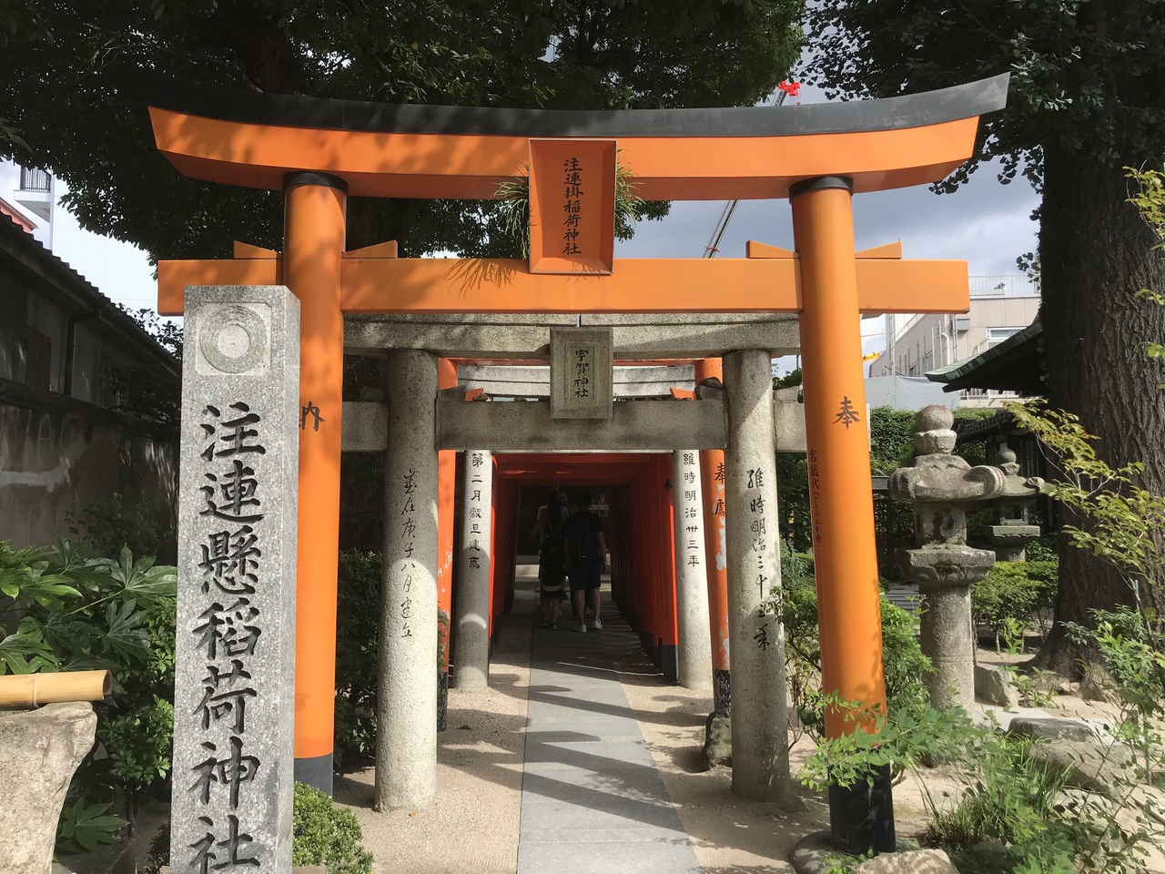 櫛田神社の裏手にあるお稲荷さんです。小さな社殿まで赤い鳥居が無数に並んでいます。別名あしどめ稲荷と呼ばれているとかで、お店の前でお客さんが足を止める商売繁盛の神様として信仰されているようです。