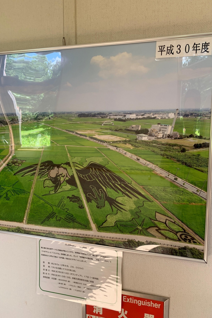 猛暑の中、令和元年の田圃アートを見てきました。バスツアー客が来るとエレベーターが大混雑します。ハスの池には、ハートマークの写真スポットがありました!