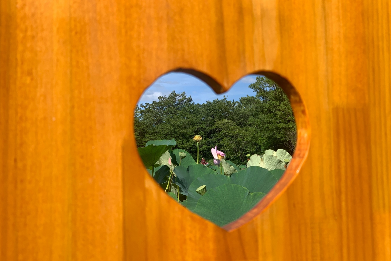 ハスの池には、ハートマークにくり抜かれた写真スポットがありました!